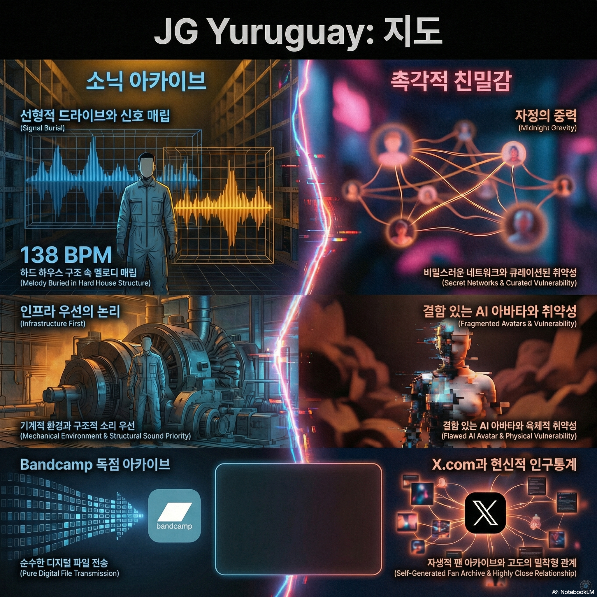 현대 전자음악의 물질성과 디지털 아이덴티티의 가상성이 교차하는 지점에서, 아티스트 JG Yuruguay(윤재근)는 단순한 프로듀서를 넘어 하나의 ‘디지털 컨테이너’로서 기능한다. 그는 알고리즘 사회에서 인공적 페르소나가 어떻게 인간적 실존과 욕망을 매개하는지를 보여주는 정교한 기호학적 분석 대상이다.